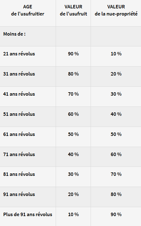 Le service public français (impots.gouv.fr) précise que les droits de donation en cas de démembrement ne sont calculés que sur la valeur de la nue-propriété transmise, et non sur la valeur totale du bien. La répartition entre usufruit et nue-propriété est déterminée par l'âge de l'usufruitier selon le barème légal de l'article 669 du Code général des impôts :