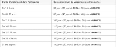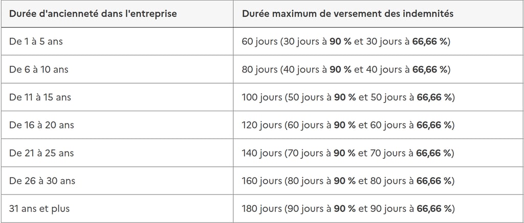 Le montant du maintien de salaire s'élève à 90 % de la rémunération brute pendant les 30 premiers jours d'arrêt, puis à 66,66 % les 30 jours suivants. Les périodes d'indemnisation augmentent de 10 jours par tranche de 5 ans d'ancienneté, dans la limite de 90 jours.